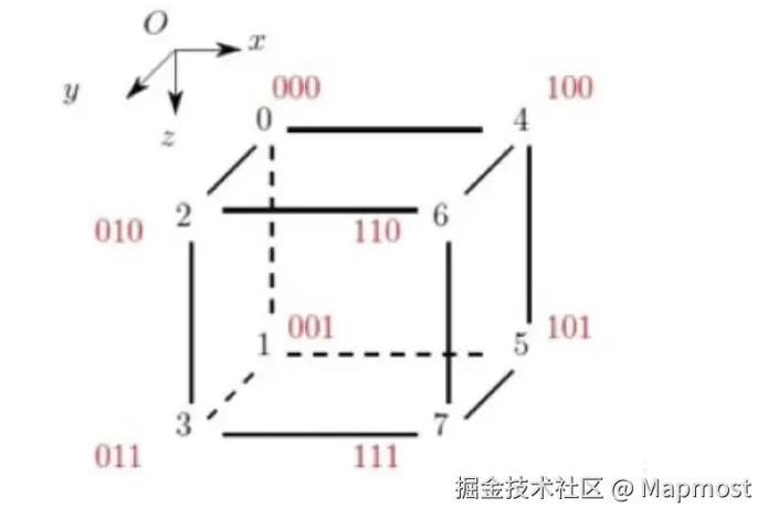子节点的索引由三个二进制位确定,分别对应x、y、z三个维度的分割(0表示较低一半,1表示较高一半)。