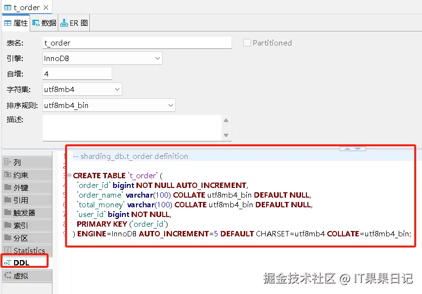 先查询逻辑库里的 t_order 表,知道自动生成的主键 order_id 字段是按照雪花算法生成的,雪花算法在 database-sharding_db.yaml 配置文件的规则 keyGeneratorName 配置的,并没有按照表主键的 AUTO_INCREMENT 自增规则创建,这一点要注意一下!