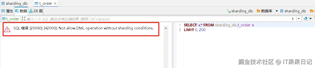 比如,查看单表数据时,会报错。这是因为连接 ShardingSphere-Proxy 时,我们看到的 t_order 表是一个逻辑表,实际的表名可能是 t_order_0 和 t_order_1 。在查询逻辑表时,必须带上分片条件。