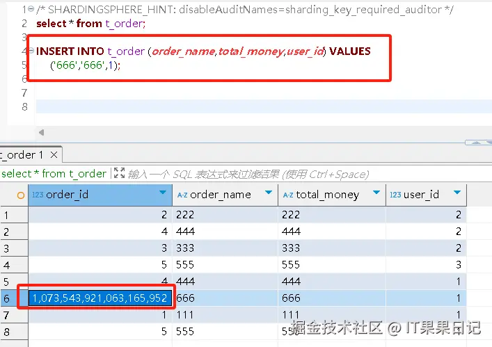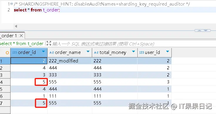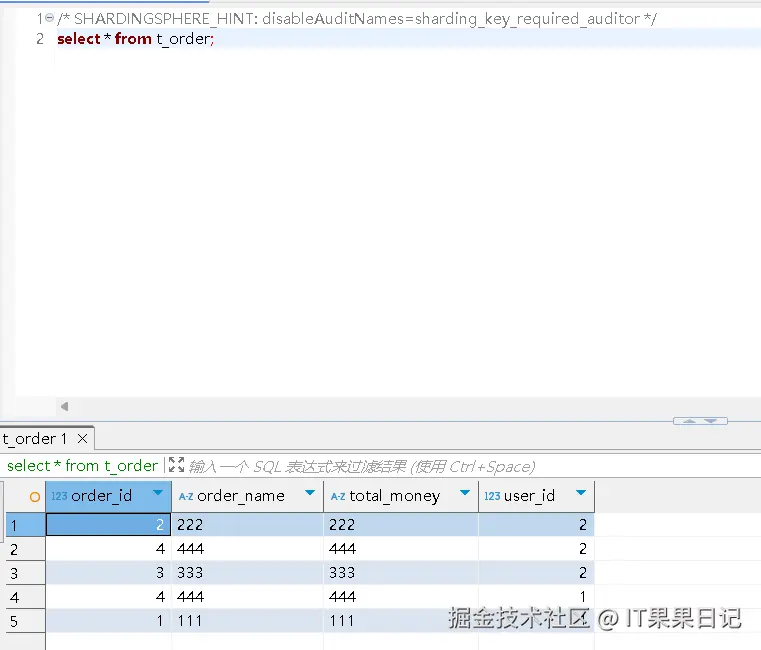 ShardingSphere-Proxy提供了 SQL Hint 作为 SQL 语法的补充。当要查询 t_order表的全量数据时,可以使用如下 sql 。 sharding_key_required_auditor表示禁用 SQL审计。