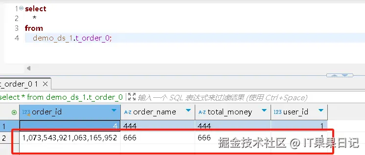 生成的 order_id = 1073543921063165952 ,对 2 取模得到 0 ,所以要去 t_order_0 分表里查找新增的记录。