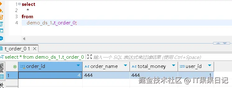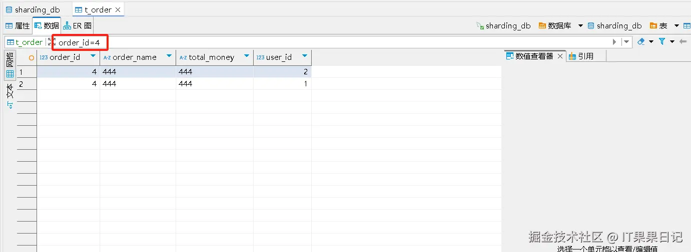此时就可以查询t_order所有的数据了。如下图中,有两个 order_id=4的数据,它们分别来自于不同的实际表。