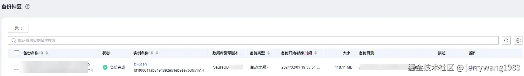 当前页面展示了所有实例的备份记录,可依据备份名称、实例名称或实例ID进行搜索。