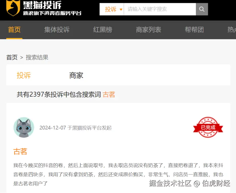 黑猫投诉平台内,累计有2397条古茗投诉,内容包括“虚假活动宣传”、“喝到苍蝇”、“喝到异物”等。