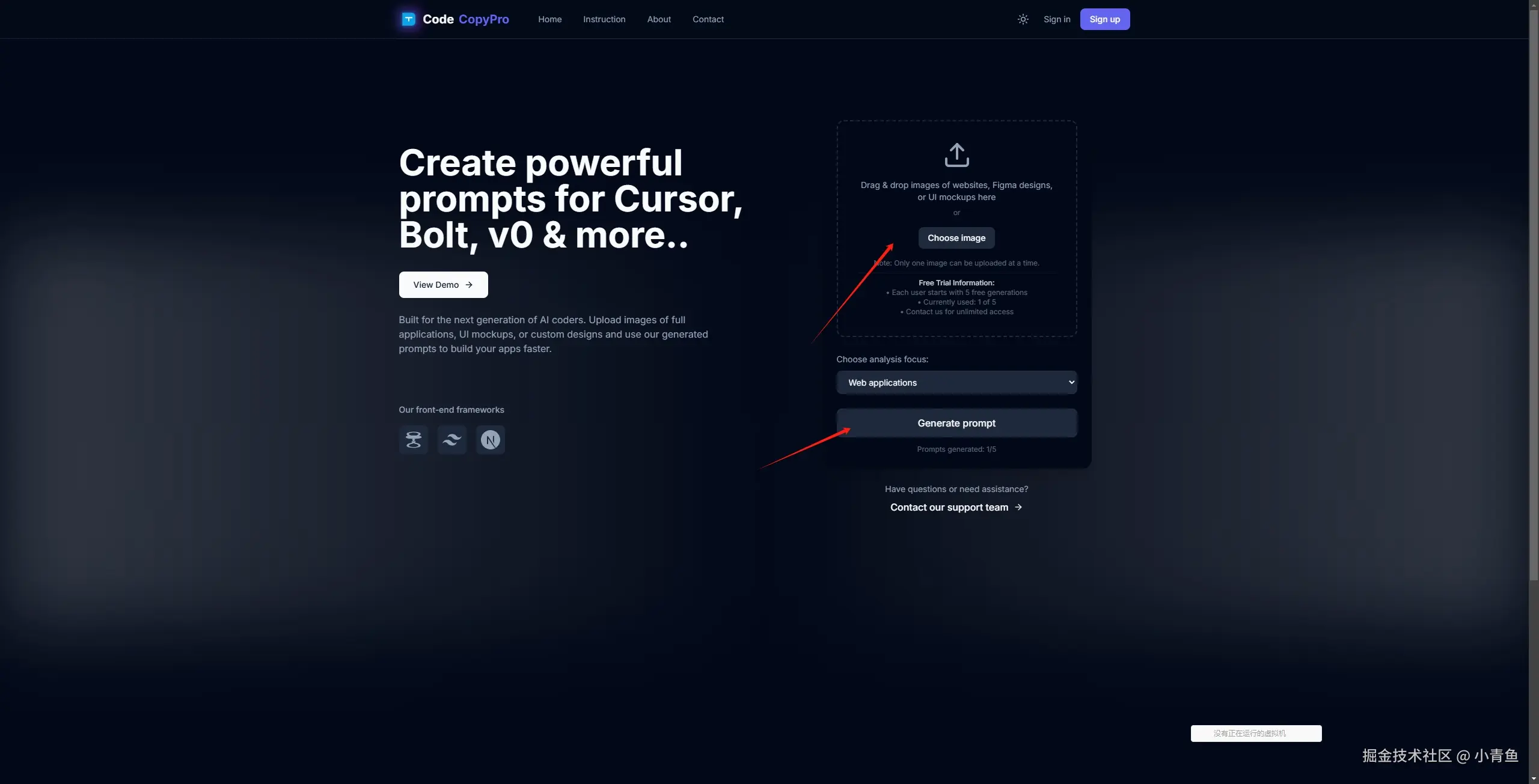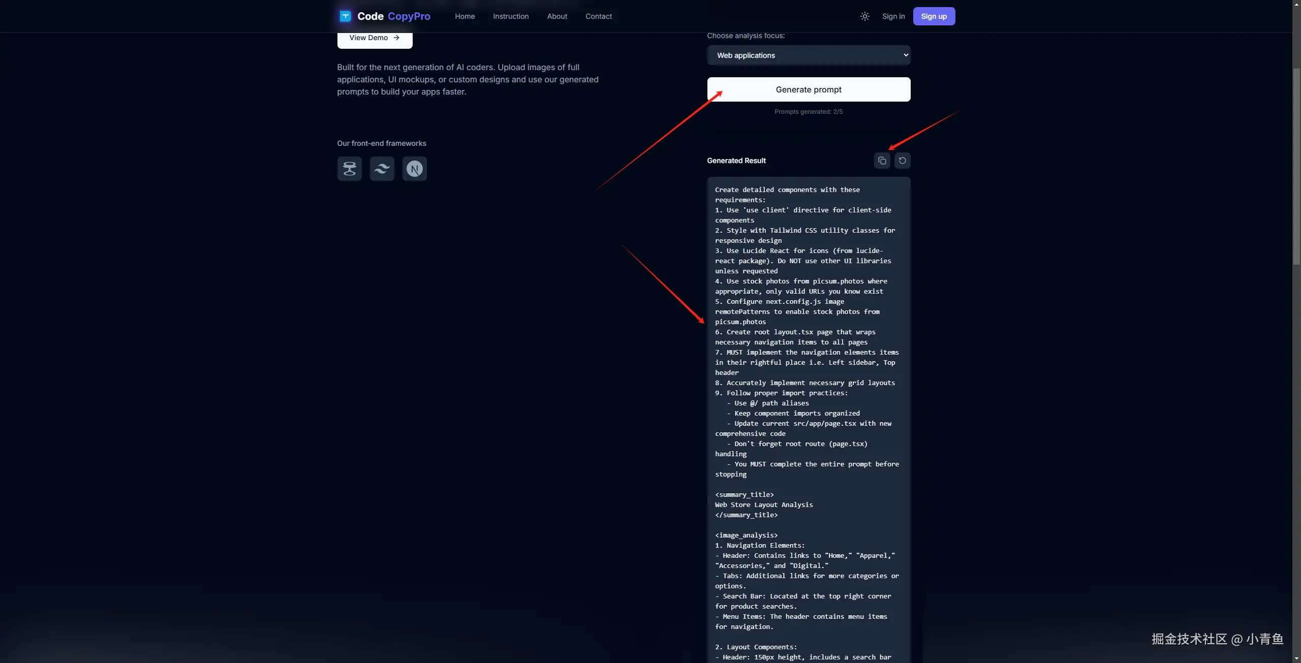 选择我们截图的图片上传,然后点击 “Ganerate prompt”,后生成一个相对比较长的提示词如下: