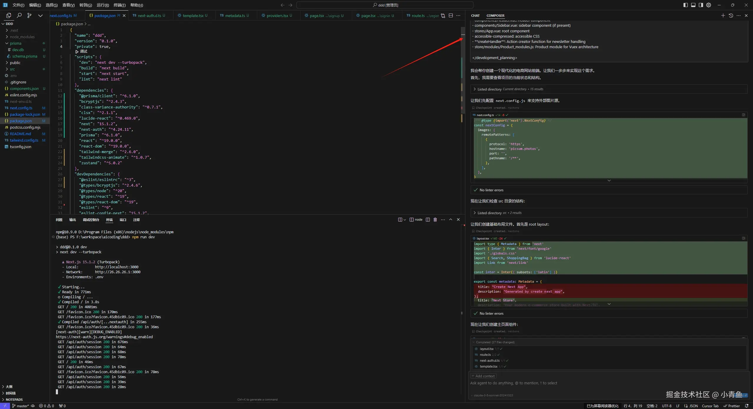 上面两个是一定要执行的,不然会出现一些坑,然后把提示词放到 composer中,等待他的执行,因为信息比较多他需要执行很多步,所以我们需要 回复 “继续“ 告诉 cursor执行,知道功能完善。