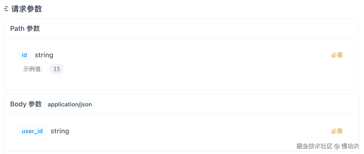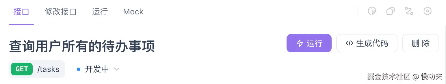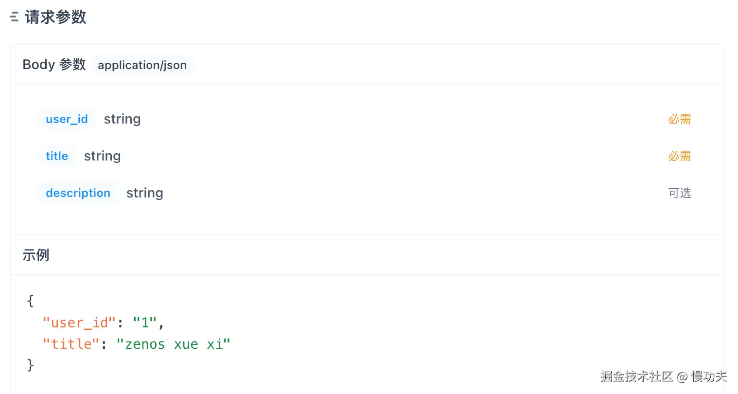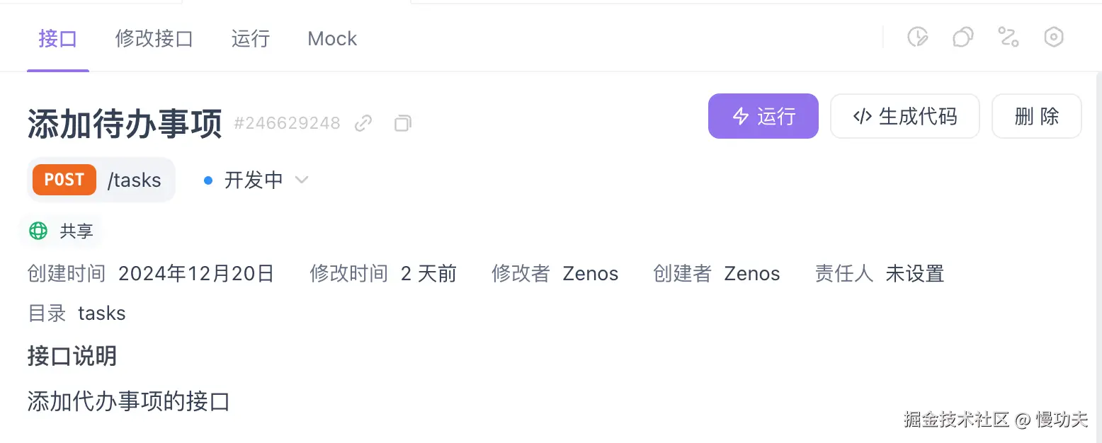 这个接口的请求方式是 POST,路径是/tasks,请求参数是 body 传输,数据类型是 json,也可以说是一个对象。