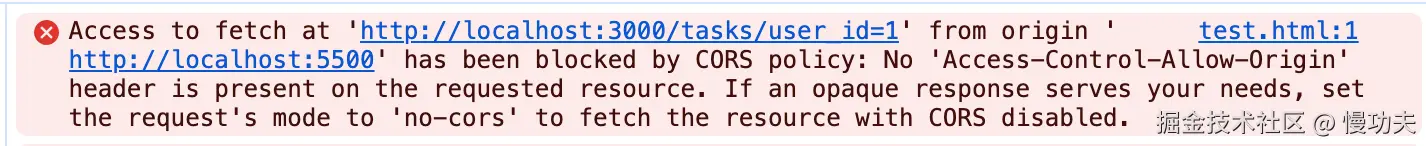 CORS 策略已阻止从源“http://localhost:5500”获取“http://localhost:3000/tasks?user_id=1”的访问:请求的资源上不存在“Access-Control-Allow-Origin”标头。如果不透明的响应满足您的需求,请将请求的模式设置为 'no-cors' 以在禁用 CORS 的情况下获取资源。