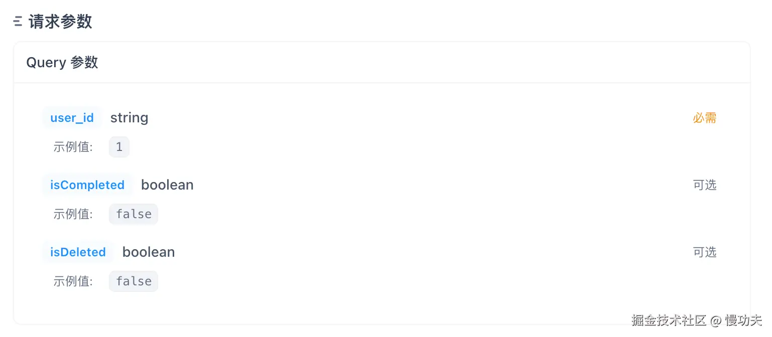 这个接口的请求方式是 GET,路径是/tasks,请求参数类型是 Query,上篇文章说过,这种类型的参数是以键值对的方式拼接在 url 后面发送给后端的。拼接方式是?key1=value1&key2=value2: