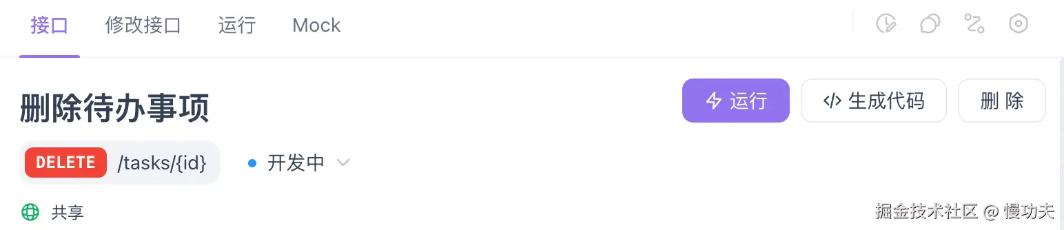 这个接口的请求方式是 DELETE,路径是/tasks/{id},请求参数有两种,一个 path,也是直接拼在路径后面。如果 path 为 11,那拼接在路径后面就是tasks/11