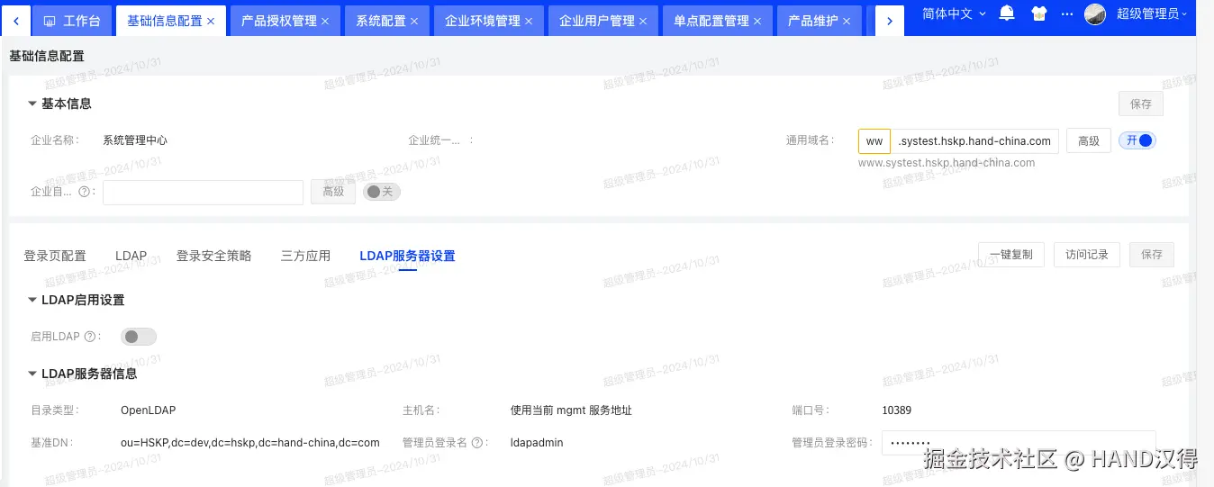 企业管理员角色: 企业信息维护>企业信息维护>基础信息配置,LDAP服务器设置Tab页。