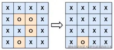 'X'单元格 连接这个区域,并且区域中没有任何单元格位于board边缘,则该区域被'X'单元格围绕。