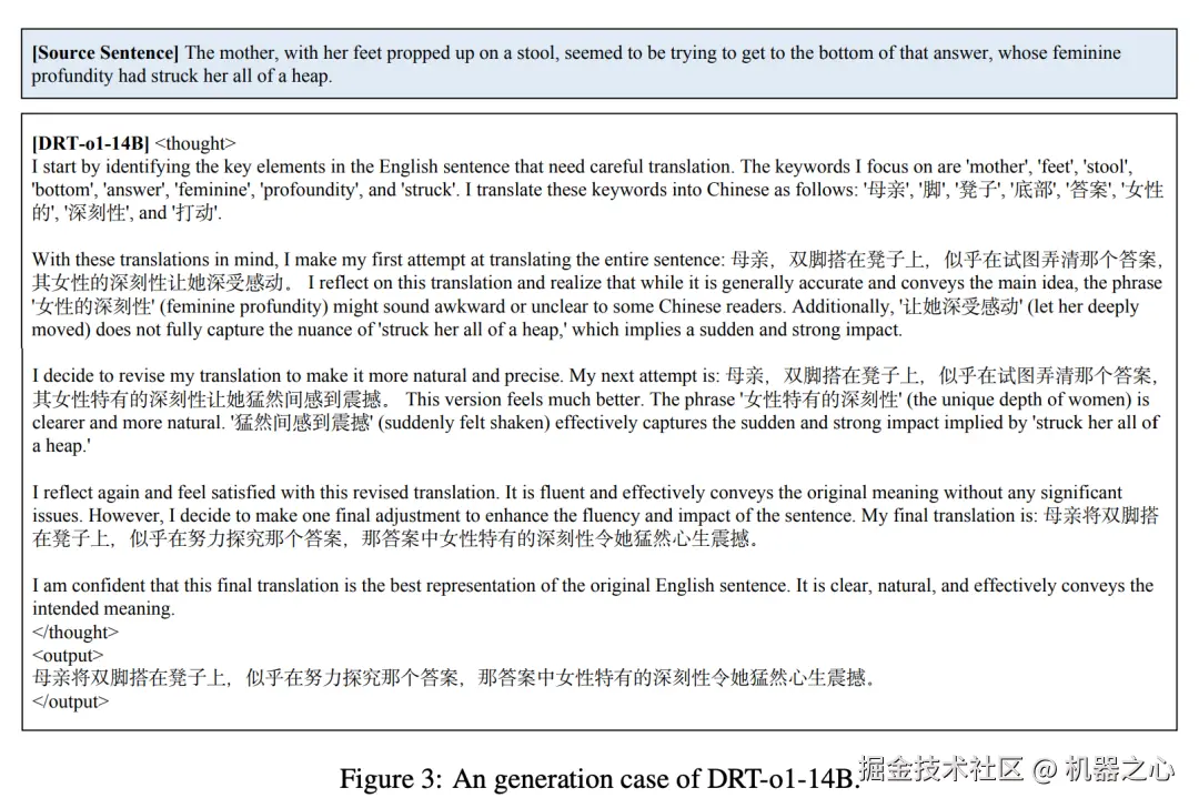 图 3 显示了 DRT-o1-14B 的一个示例。可以看到,该模型学习了收集的数据的思维过程。DRT-o1-14B 首先执行词级翻译,然后尝试初步翻译。接下来,它会不断改进翻译,直到它认为翻译足够好为止。