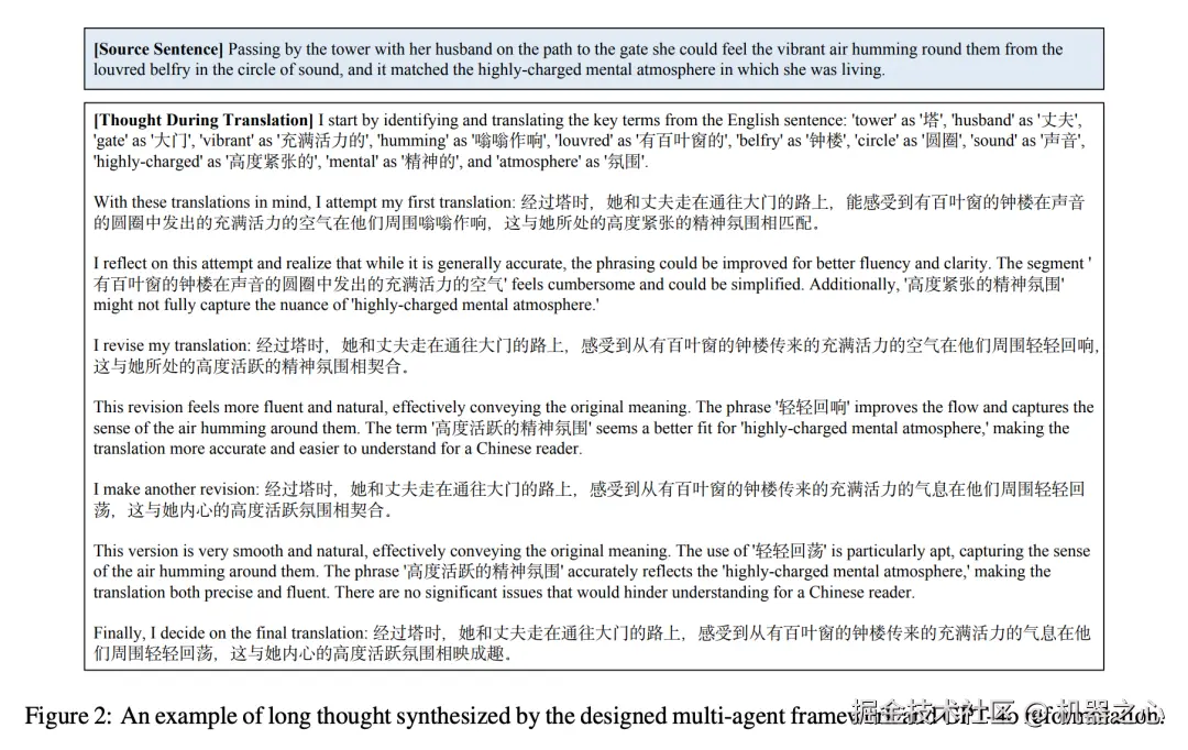 对于其余样本,研究者效仿 Qin et al. (2024) 的做法,利用 GPT-4o 将 P ′ (s) 修改并打磨为自我反思描述。最后,获得了 22264 个带有长思考的机器翻译样本。图 2 举例说明了合成结果。