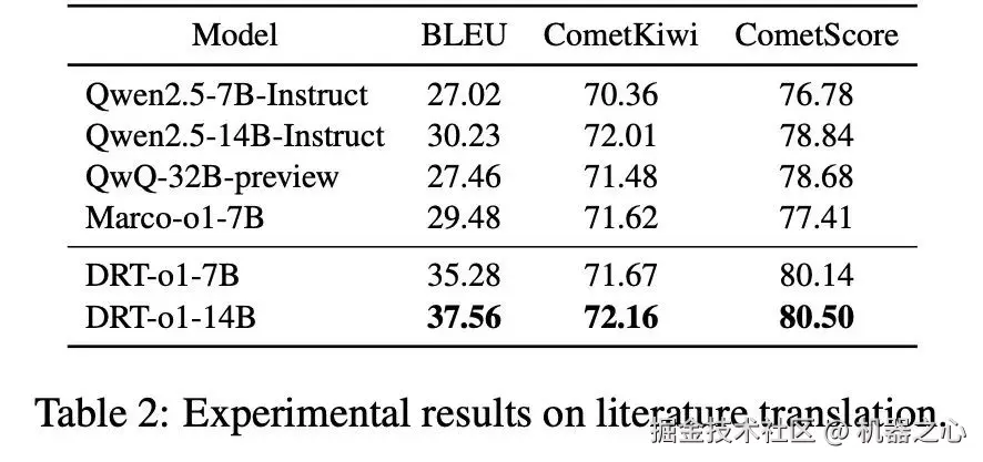 为了计算 CometKiwi 和 CometScore,研究者使用了官方代码和官方模型。为了计算 BLEU 分数,使用 sacrebleu 工具包计算语料库级别的 BLEU。此处,研究者采用 Qwen2.5-7B-Instruct 和 Qwen2.5-14B-Instruct 作为 DRT-o1 的骨干。