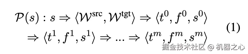 其中,P (s) 表示 s 的多智能体思考过程,m 为迭代步数。为了强调有效的思维过程,没有分数变化的翻译将被删除。也就是说,如果 s^i 等于 s^(i-1)(i = 1,2,...,m),研究者将舍弃 P (s) 中的⟨t^i , f^i , s^i ⟩,结果为: