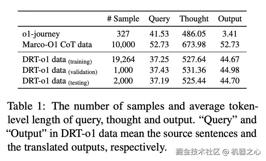 研究者将收集到的 22264 个样本分为训练集、验证集和测试集,样本数分别为 19264、1000 和 2000。表 1 列出了 DRT-o1 数据和以往类似 O1 数据的数据统计。对于 Marco-O1 CoT 数据,由于其尚未完全发布,此处使用其演示数据来计算数据统计。可以看到,合成的思考中的平均 token 数达到了 500 多个,这与之前面向数学的 O1 类 CoT 数据相似。