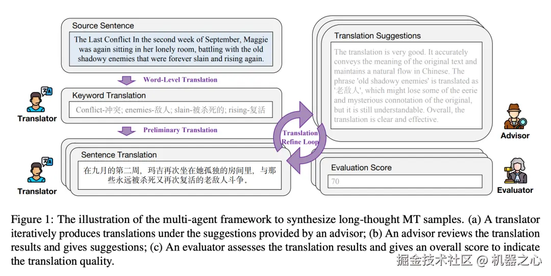 对于每个预先收集的句子(用 s 表示),研究者设计了一个多智能体框架,通过长时间的思考将其从英文翻译成中文。如图 1 所示,框架包括三个智能体:翻译者、顾问和评估者。合成过程如下: