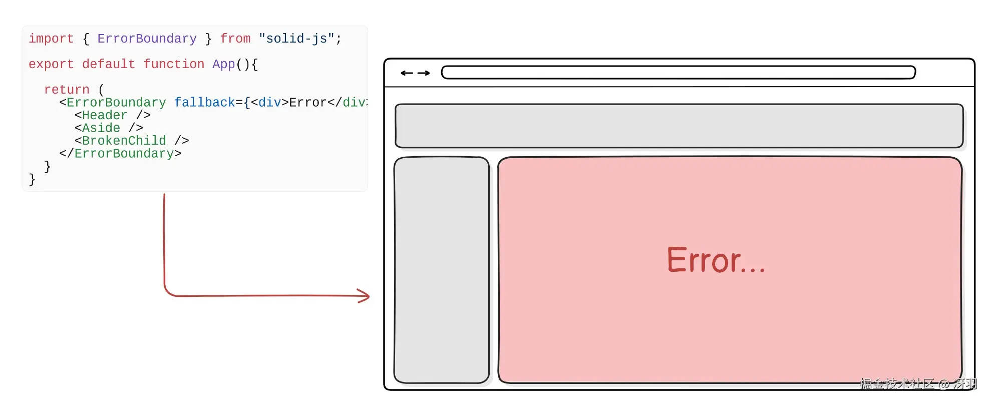 <ErrorBoundary> 是一个可用于捕获子组件抛出的错误的组件。当遇到错误时,该组件将呈现 fallback UI,而不是有问题的子组件。