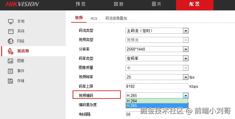 如果没有录像机,则需要网页单独访问摄像机,在配置界面修改视音频,【视频编码】为H.264。