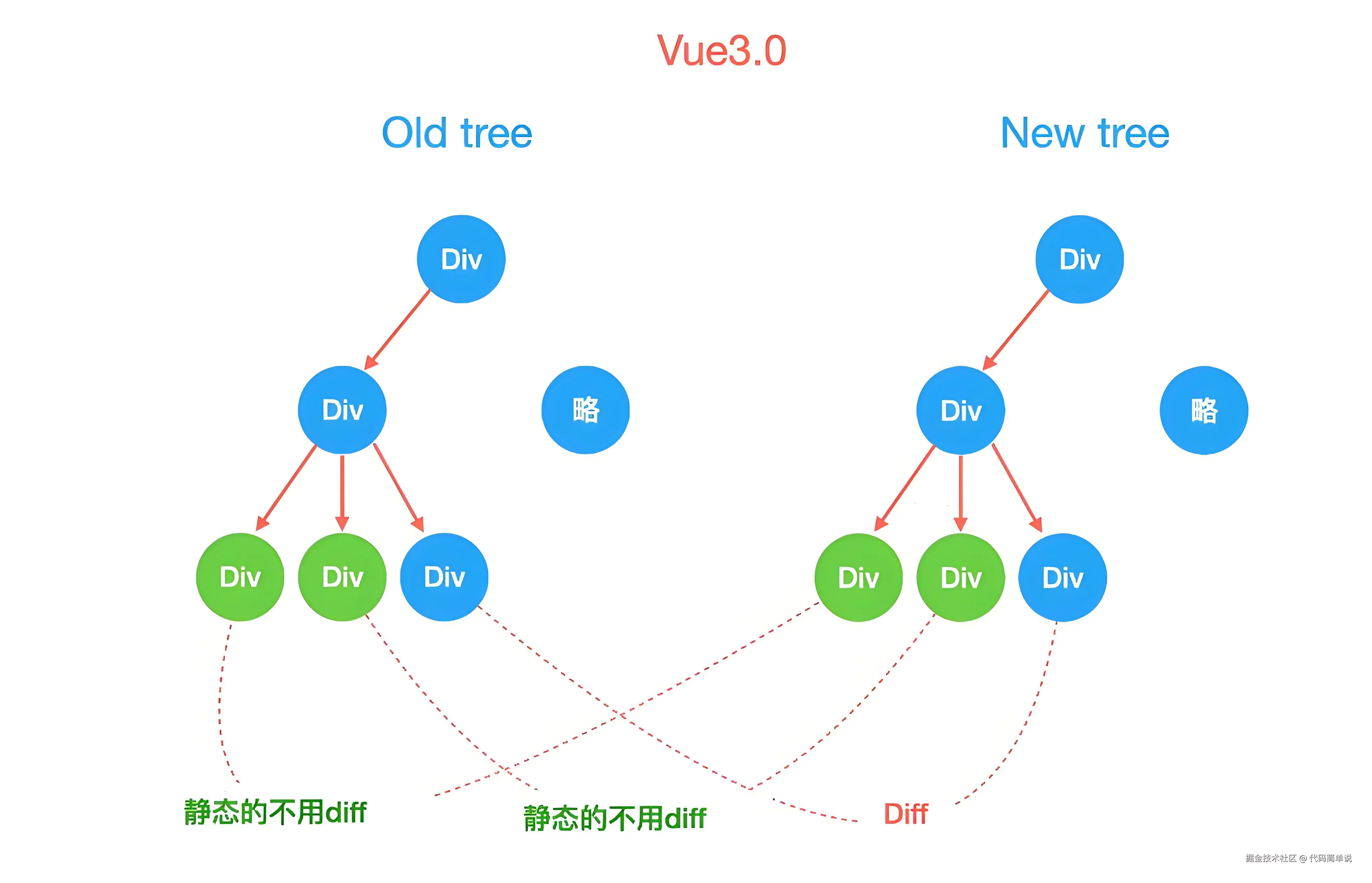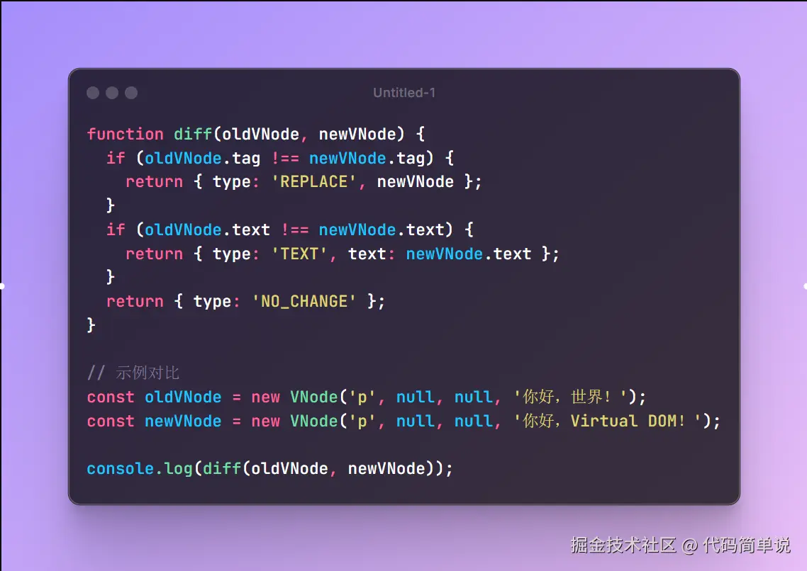 为了让原理更直观,我手写了一个超简单的 Diff 算法,只对比同层节点: