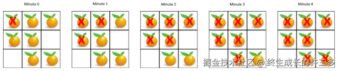 每分钟,腐烂的橘子 周围 4 个方向上相邻 的新鲜橘子都会腐烂。