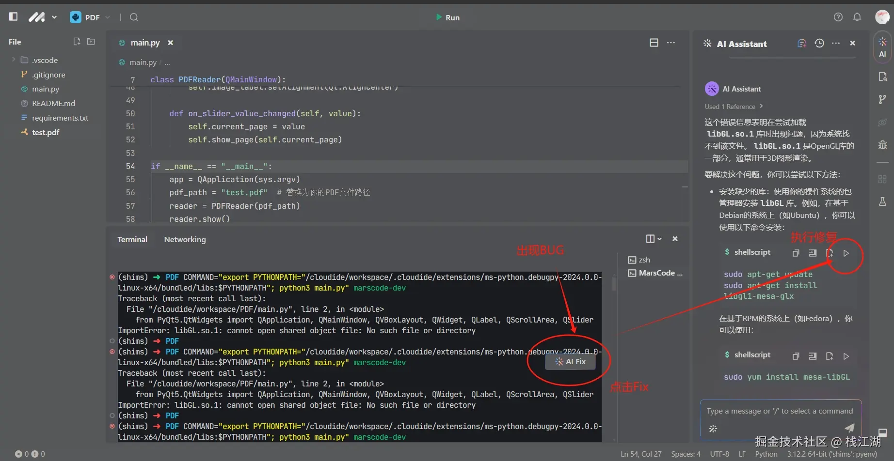 当运行程序出现bug后,“AI Fix”图标会自动出现,点击后会可以通过AI生成相应的解决方案,解决方案里也会有相应的按钮半自动化的处理,非常的方便。