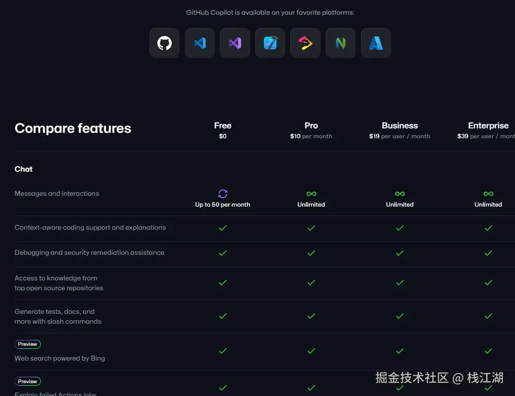 - 每月 2000 次代码补全:无论是写函数、修 Bug,还是优化代码,Copilot 都能帮你快速完成。对于个人开发者和小型项目来说,这个额度完全够用。