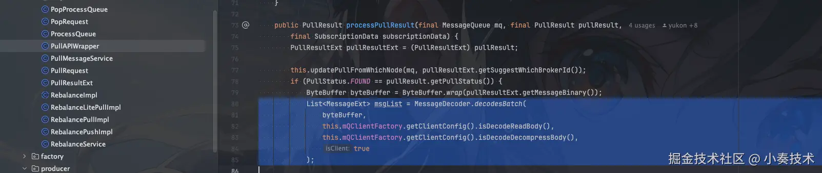 在client拉取到消息成功后对PullResult对象进行处理执行decodesBatch方法