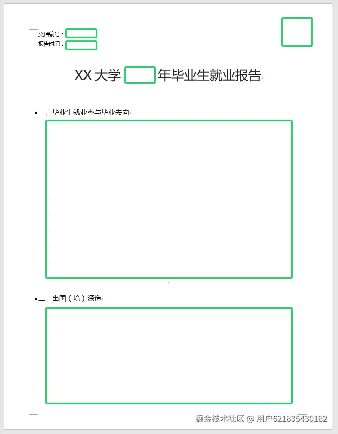 比如我们开篇看到的大学毕业生就业报告,我们可以先做成如上图所示的 word 模板,图示绿色线框位置就是需要定期更新的部分,预先在这些位置插入书签(比如书签名为:编号,时间,logo,年度,报表,统计图),以此标记要插入到 word 的内容对应插入到什么位置。
