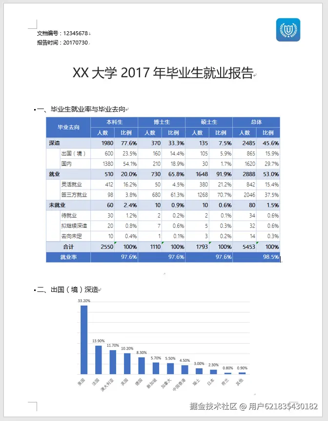 这是一个某大学年度毕业生就业报告,其中表格和统计图的数据来自数据库,如果通过报表工具,制作这样的表格和统计图是轻而易举的事情,但如果要把这些报表和统计图做到 word 报告里就麻烦很多。以往有两个办法:一个是每次做好报表和统计图之后,导出为 word,再手工复制粘贴到 word 报告中;第二个是把整个报告都做成一个报表模板,然后再一起导出为 word。 方法一,纯手工操作效率低;方法二,报表工具排版能力有限,生成的 word 版面效果不够完美。