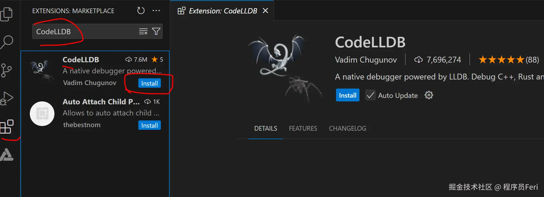 安装 DevEco Device Tool 运行的依赖 CodeLLDB 插件,因此需要再 VSCode 的扩展包管理处搜索并安装。如下所示:
