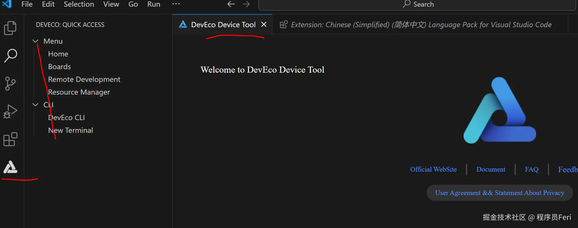 重启 VSCode 软件,点击左侧的扩展列表,即可打开 DevEco Home 界面,表示成功安装开发环境: