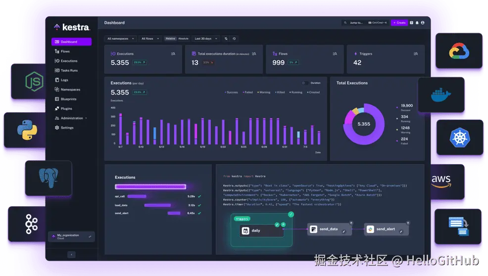 15、kestra:事件驱动的声明式编排平台。这是一个基于 Java 开发的事件驱动编排平台,旨在简化计划性和事件驱动工作流。它提供直观的 Web 界面,内置代码编辑器和数百个插件,用户可以通过 YAML 代码轻松构建可靠的工作流,支持编排微服务、批处理任务、临时脚本、SQL 查询、数据同步等多种任务。来自 @啊gBAfV 的分享