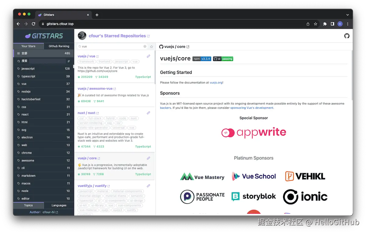 17、gitstars:你的 GitHub Star 管家。这是一个用于管理 GitHub 上 Star 项目的工具,支持根据标签和编程语言对项目进行分类。来自 @cfour 的分享