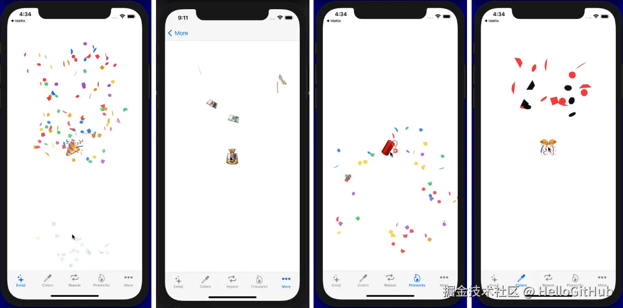 29、ConfettiSwiftUI:五彩纸屑动画效果的 Swift 库。这是一个用于添加五彩纸屑动画效果的 Swift 库,支持自定义纸屑形状、爆炸半径和角度。