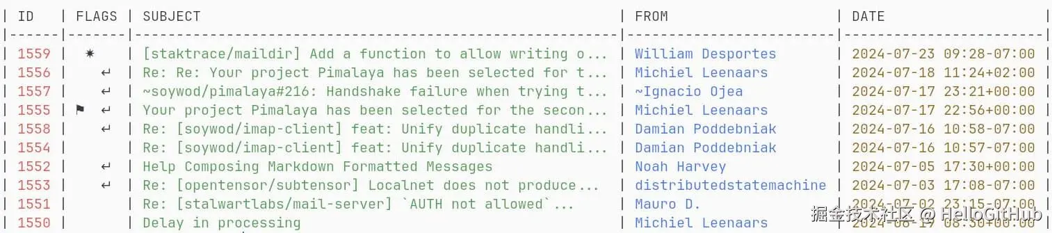 27、himalaya:管理邮件的命令行工具。这是一个用 Rust 开发的命令行电子邮件客户端,支持多账户、邮件收发、多种邮件协议(如 IMAP 和 SMTP)和 PGP 加密等功能。