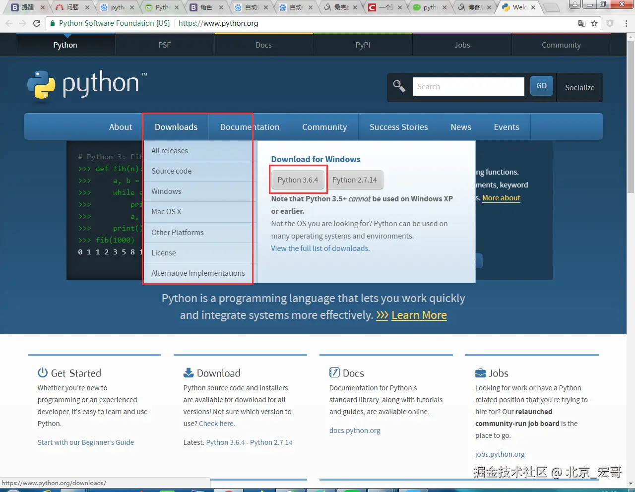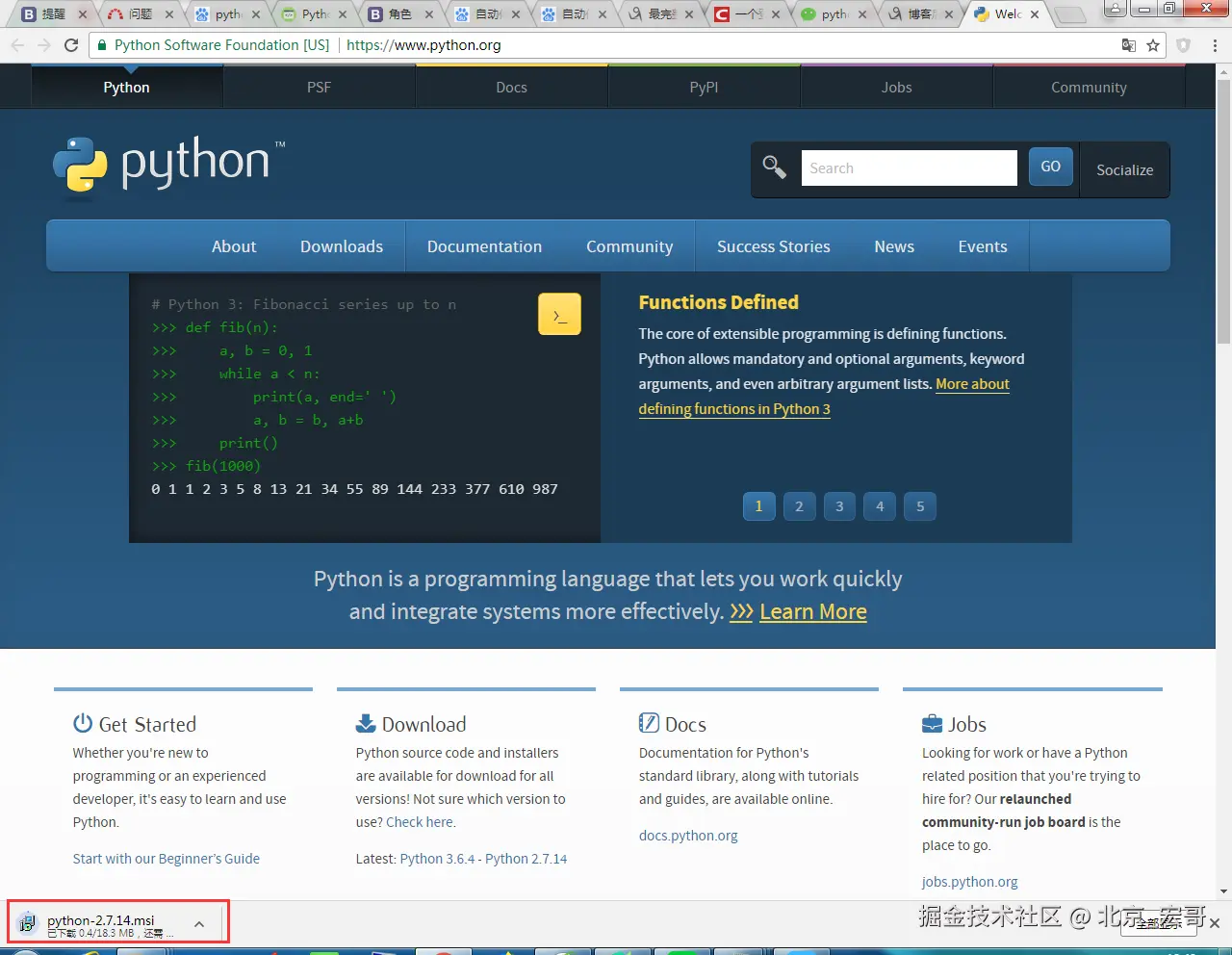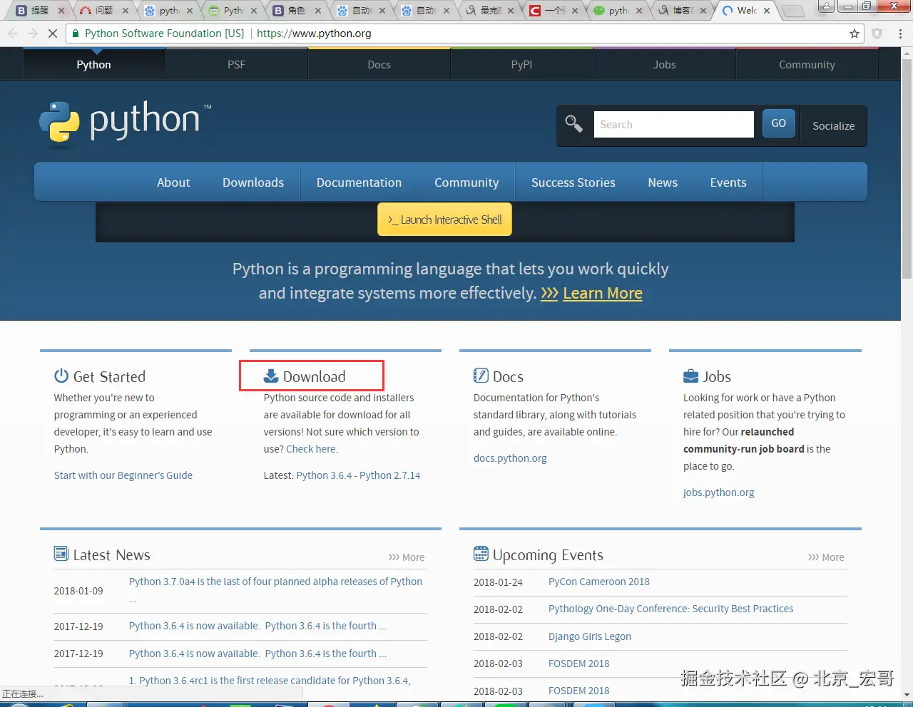 第一步:进入python官网,点击download,如下图所示: