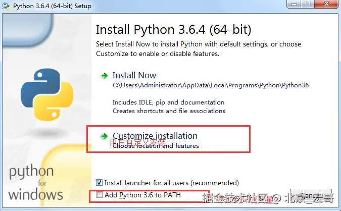 3.在这里我选择的是自定义安装(Customize installation),一定要勾选Add_Python 3.6 to PATH,防止手工添加环境变量 ,添加到环境变量也可以等安装完成之后手动添加到环境变量中,如果不添加环境变量运行python时则会出现如下界面: