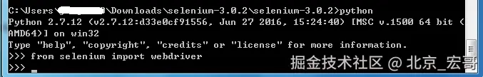 在cmd输入python进入python环境,然后输入 from selenium import webdriver,如果不报错就代表selenium安装成功。