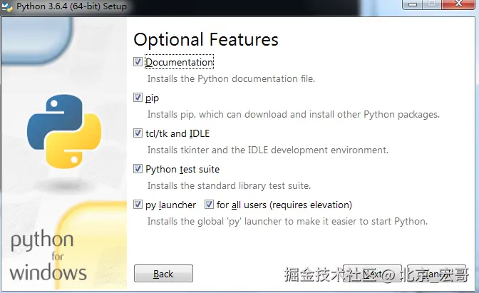 6.选择安装的属性,Documentation、pip、tcl/tk and IDLE 必须安装,tcl/tk and IDLE是Python环境的开发环境窗口,pip用来安装numpy等package。