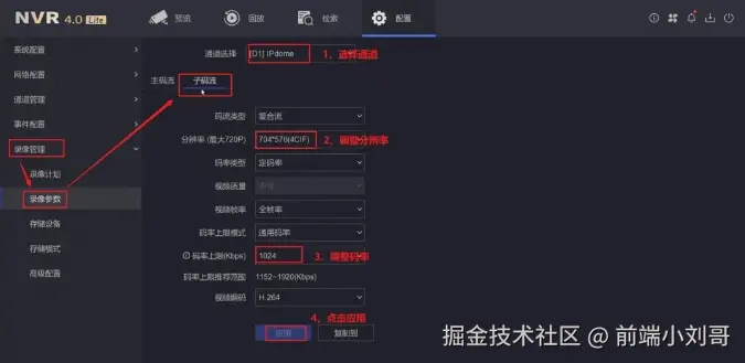 可适当降低对应通道画面的子码流的“分辨率和码流上限”。