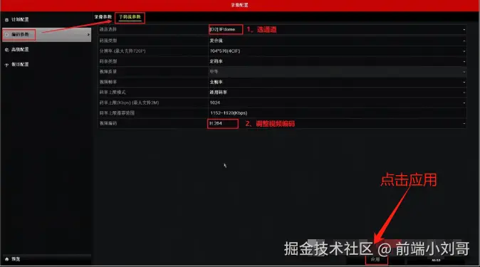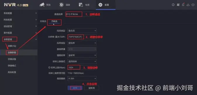 注:如果若切换子码流的时候提示“该通道不支持此项功能?”可通过网页访问摄像头IP地址,接入配置——音视频页面,修改摄像机的子码流参数,一般子码流分辨率不宜过大;或者将摄像机通道删除,重启摄像头后重新搜索添加,避免子码流取流异常的情况;