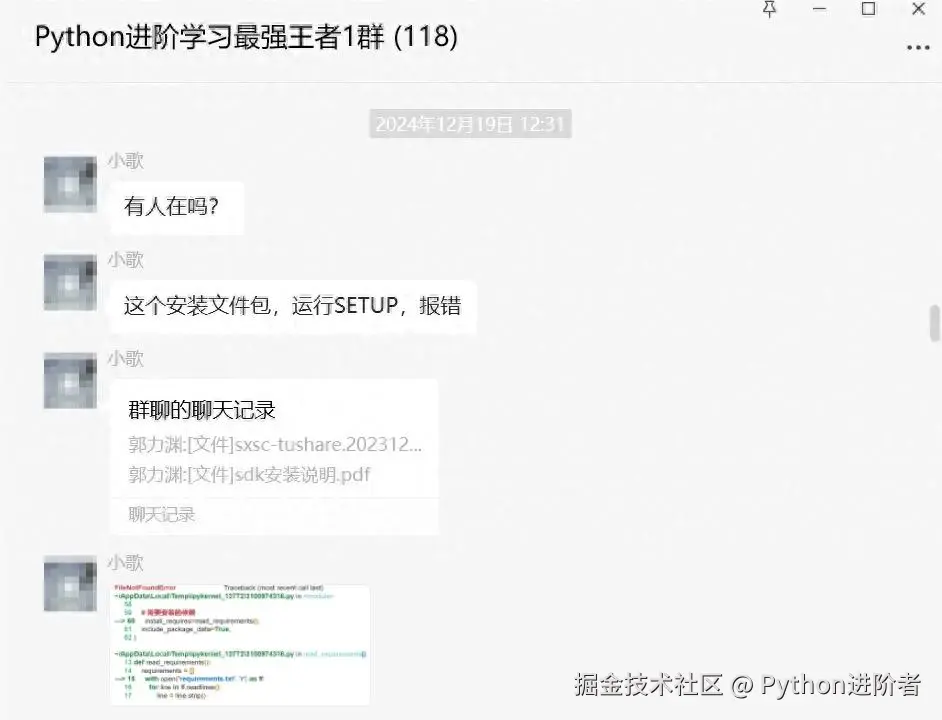 【提问补充】温馨提示,大家在群里提问的时候。可以注意下面几点:如果涉及到大文件数据,可以数据脱敏后,发点demo数据来(小文件的意思),然后贴点代码(可以复制的那种),记得发报错截图(截全)。代码不多的话,直接发代码文字即可,代码超过50行这样的话,发个.py文件就行。