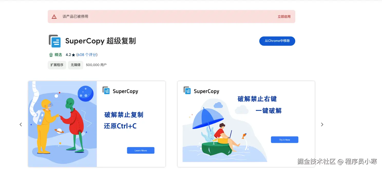 在无痕模式下,发现是可以正常打印的,所以首先就怀疑是浏览器插件的问题,于是在正常模式下,把所有chrome扩展插件全部禁用,果然发现可以正常打印了,然后利用二分法(即先开一半的插件,看是否正常,如果正常,那么有问题的插件就在另一半中,依此类推),经过一顿查找,终于找到罪魁祸首了,就是这个SuperCopy 超级复制插件。