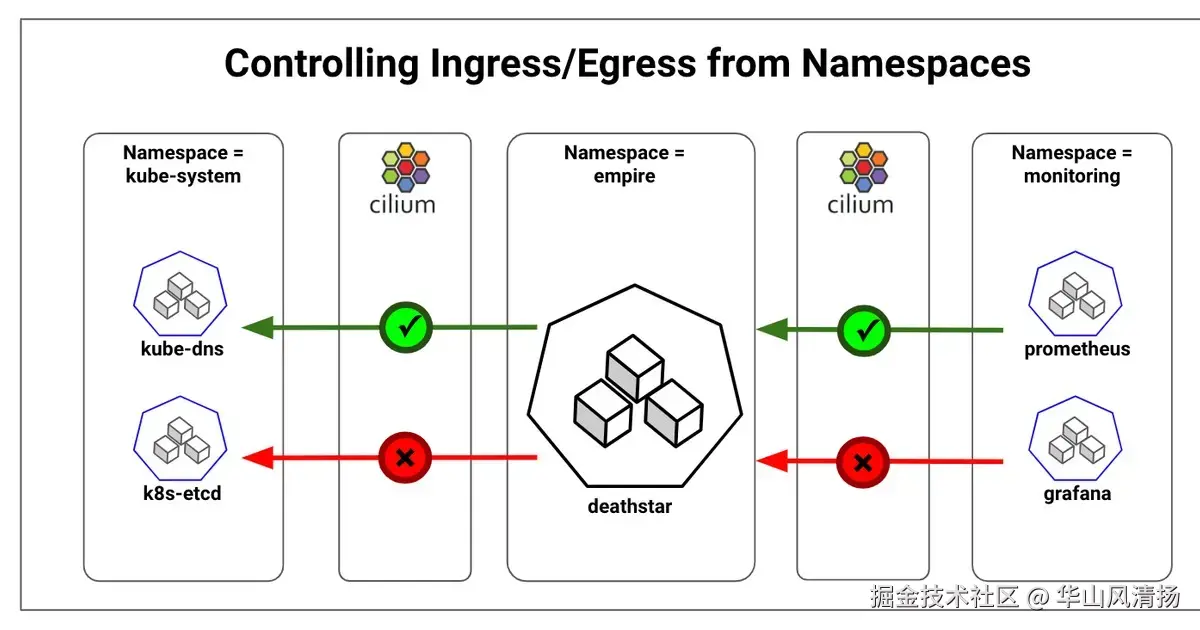 此策略意味着 production 命名空间内的所有 Pods 都不会允许来自 dev 命名空间的流量。这种隔离方式类似于公司内部不同部门的隔离:生产部门的数据不允许被开发部门随意查看,以确保信息安全性。