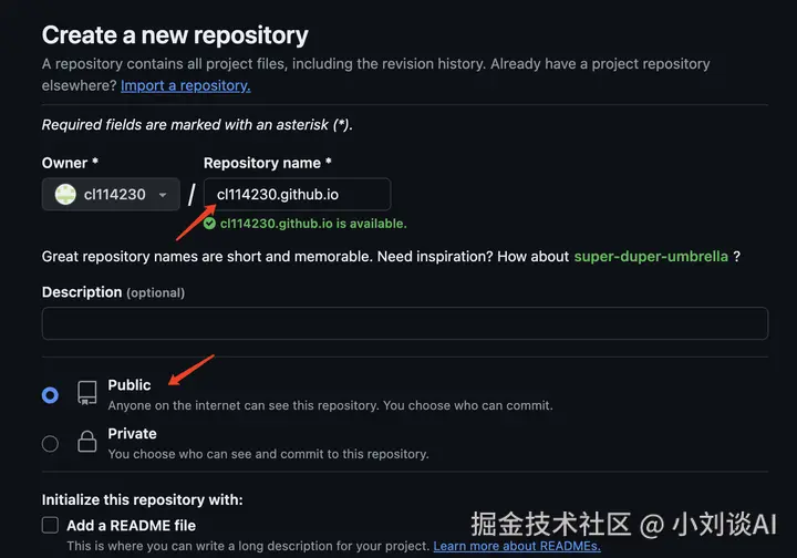 注册/登录 GitHub,新建一个 Repository,Repository name一定要是你的用户名.github.io