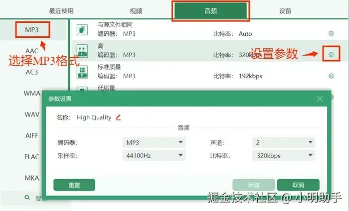 第三步:进入输出格式选择界面后,点击界面上方【音频】按钮,选择MP3格式。如果有需要的话,点击界面右侧的小齿轮按钮设置比特率等参数。