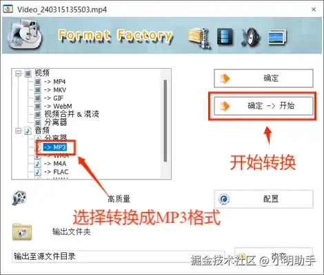 第二步:在弹出窗口中选择MP3格式,然后点击【确定->开始】按钮开始转换视频格式。