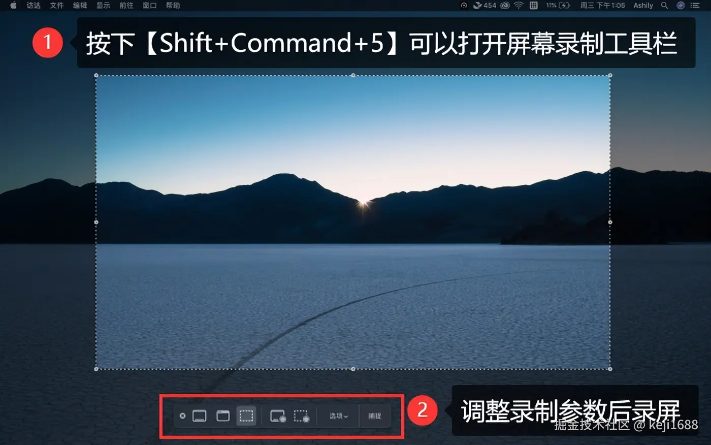 步骤1:在键盘上按下 【Shift+Command+5】 组合键。在工具栏中选择全屏录制、选定区域录制或摄像头录制。